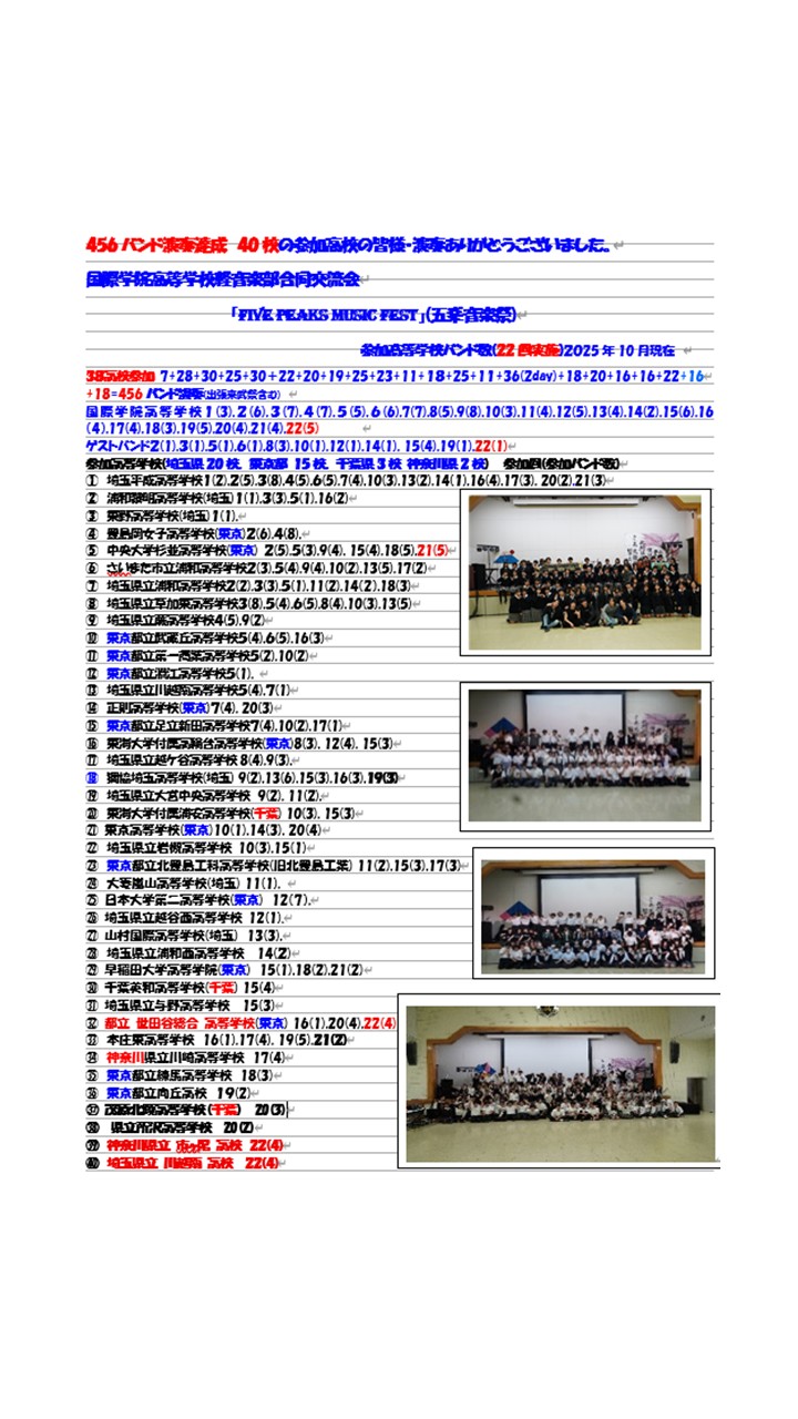 2025年4月20日(日) 第20回国際学院軽音楽部主催軽音楽合同交流会「FPF」実施予定 参加高等学校 都立世田谷総合高等学校(4) 東京高等学校(4・東京) 茂原北陵高等学校(3・千葉) 埼玉平成高等学校(2), 埼玉県立所沢高等学校(2), 正則高等学校(3.東京), 国際学院高等学校(4) 合計22バンド演奏予定 PAは新2年生(副部長)・新3年生(部長)がオペレートします。(PA音響関係の指導で専門学校ESPのプロの先生が3名でアドバイス。)